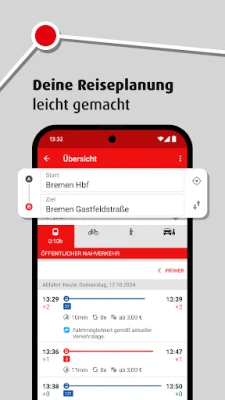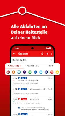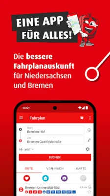Plan your journeys from door to door or from stop to stop withing Lower Saxony, Bremen, Hamburg and Germany-wide for all train journeys. The app shows you all relevant journeys by train, bus, tram or subway, as well as taxi, bike- or car-sharing. Departures and arrivals at stops and stations are available in real-time – always up-to-date.