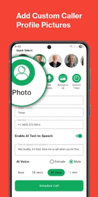Simulate a call from a boss, a girlfriend, a police officer, or a celebrity. You control the name, the photo, and the audio voice!