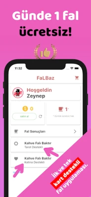 - Kahve falınız yalnızca fincan fotoğrafları ile sınırlı kalmasın! - Standart kahve falı uygulamalarını bir adım ileriye taşıdık. FaLBaz ile fincanınızı tarot ya da katina destelerinden seçeceğiniz kartlarla destekleyin. - Yorumcular fincanınız ve kartlarınızı birlikte yorumlasın. - Böylece çok daha kapsamlı bir fal sonucu ile karşılaşacaksınız. - Her gun 1 adet ücretsiz kahve falı hakkı hesabınıza tanımlı. - Ayrıca falınızı gönderirken istediğiniz soruları sorabileceksiniz. - Her baktırdığınız tarot ya da katına destekli kahve falı için hediye krediler kazanacaksınız.