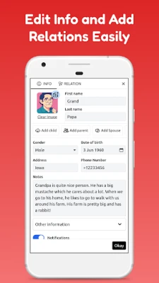 You can add information like name, gender, date of birth, date of death etc. You can also add photo for the members of the tree.