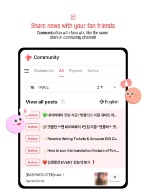 (G)I-DLE, AB6IX, ATBO, BAE173, CIX, CLC, DKZ, DRIPPIN, iKON, NiziU, NMIXX, OnlyOneOf, P1Harmony, Kang Daniel, SF9, VIVIZ, NOWADAYS, NewJeans, THE BOYZ, The Wind, DAY6, TVXQ, Dreamcatcher, RIIZE, Red Velvet, Lapillus, LE SSERAFIM, MAMAMOO, MONSTA X, BTS, BABYMONSTER, BOYNEXTDOOR, BLACKPINK, SEVENTEEN, STAYC, Stray Kids, IVE, IU, ILLIT, &TEAM, aespa, ATEEZ, Apink, EXO, NCT, ENHYPEN, ZEROBASEONE, Kep1er, KISS OF LIFE, TXT, TWS, TREASURE, tripleS, TWICE, fromis_9, PLAVE and many more celebrity communities provided.