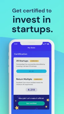Players qualify for Certification if they invest in 25 or more startups and achieve a 3X return multiple on their investments. For example, a player investing a total of $10,000 must return $30,000 by the end of the course.