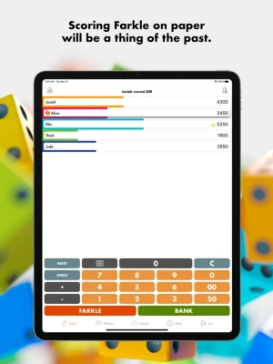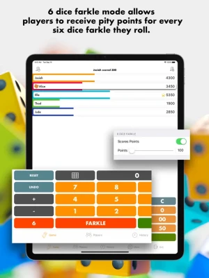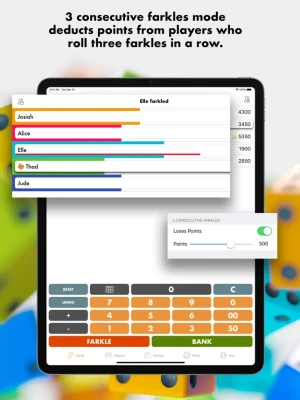 • "3 consecutive farkles" mode - you control the amount of points to deduct from players who roll three farkles in a row. Watch as the heat turns up each time the farkle hits.