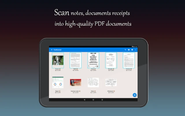 Fast Scanner turns your Android devices into a multiple pages scanner for documents, receipts, notes, invoices, business cards, whiteboards and other paper text. With Fast Scanner, you can quickly scan your document, then print or email them as multiple pages PDF or JPEG files. Moreover you can save the PDF files in your device or open them in other apps.