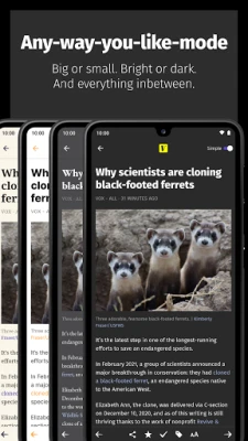 Whether you use Feeder for large consumption or casual browsing. Read content in the way that suits you. Light theme for the day, dark theme during the night. Use compact mode to maximize content or simple mode to remove all clutter.