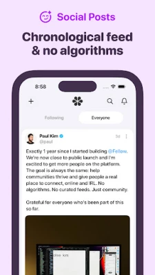 Social media broke the promise of connection. Algorithmic feeds prioritize engagement over relationships. Fellow is different. We believe communities should be: