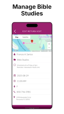 - Manage Return Visits: Keep contact details organized and set reminders for Bible studies and return visits.