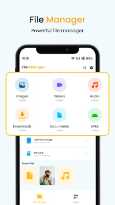 Whether you want to find downloads, manage documents, free up storage, or explore folders, File Manager gives you full control — all in one clean interface.