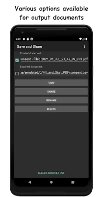Input PDF documents can be opened directly from your device's file manager or they can be accessed via app's built in file browser.