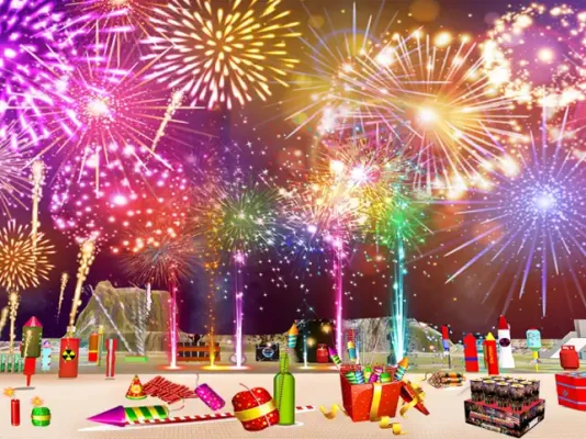 Do you enjoy fireworks on Diwali? Do you want to design your spectacular shows? Do you want to have fun with explosive items and props? If yes, then Fireworks Games Cracker 3D is the game for you. A fireworks cracker simulator 3D game with 3D graphics and realistic fireworks effects to uplift your enjoyment of the Diwali festival, Christmas, or New Year's fireworks night without causing pollution in the environment. That will make you feel like you are in a real fireworks show in fireworks games cracker simulator3d game. You can explore different smoke-free maps and scenarios and light up the sky with various types of fireworks while sitting on your couch.
