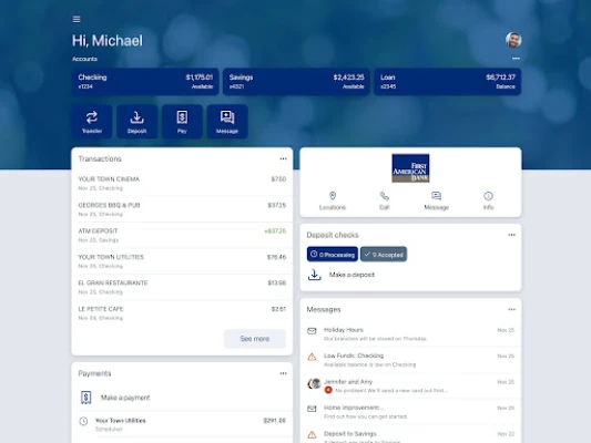 The First American Bank mobile app gives you the flexibility and convenience to manage your accounts on the go. It’s fast, secure and makes life easier by empowering you with the tools you need to manage your finances.