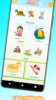 Our app includes 9 child-friendly categories and over 100 words! The flashcard teaching method is the best for babies, toddlers, and kids, allowing them to learn at their own pace. Your child will learn everyday words while having fun. Play and learn together with your child!