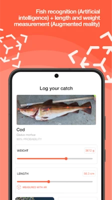 Using advanced camera technology and our own team of AR and AI developers, we've created the world's best fish recognition feature. By including AR, we can accurately measure length and provide an estimate of weight. This gives you quick and easy information, and if you share it with us, it will contribute to the management of SDG 14: Life below water.