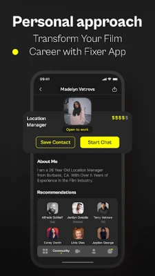 • Connect: Easily build your professional network with FIXER's intuitive platform, designed for film industry professionals to connect and communicate. Save contacts for future projects, engage in real-time chats, and exchange ideas with like-minded individuals from all over the world.