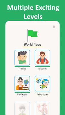 📊 Numerous levels. Start learning geography as a Trainee and become a Legend in guessing national flags and world capitals. You will begin with the flags of large countries, such as the US, France, Japan, and Australia, and then proceed to smaller countries and island states, including Bhutan, Georgia, Haiti, and Fiji.