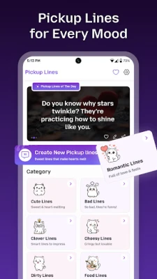 Flirt Messages app features a user-friendly design, allowing you to browse, select, and send lines in just a few taps - perfect for everyone!