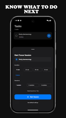 Add study tasks and work goals directly inside the app. See your active task on the timer screen so every session has a clear purpose and direction.