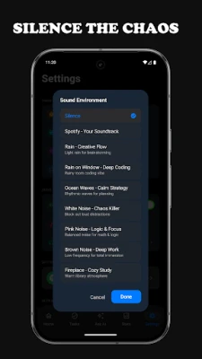 Your environment shapes your focus. Focus Flow ships with audio environments designed for deep work:
