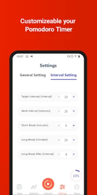 Our app acts as a Pomodoro timer, breaking up tasks into discrete intervals, with short breaks in between and longer breaks after 4 intervals. You can customize the duration of these intervals, short breaks, and long breaks to fit your specific needs. This way, you can work in focused, productive bursts and still have time to relax and recharge.