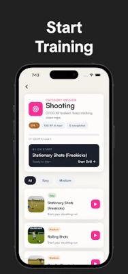 Earn XP for every drill you complete. Level up across each skill category, build your player card, and maintain training streaks to stay consistent.