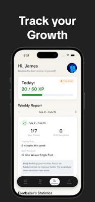 Get detailed weekly breakdowns of your training data. Every AI analysis is saved so you can track how your skills improve over time. Your player card displays your level, position, and skill ratings at a glance.