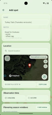 Public spots are on their way. Soon you'll be able to browse locations that other foragers have chosen to share - and decide whether to contribute your own.