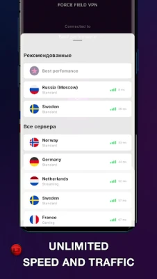Your favorite websites and services: tik tok, instagram, netflix and others, with no speed or traffic limits. No annoying ads or hiccups, total privacy, global reach - all this is Force Field. Wherever you are, your data is always safe, at home or while traveling, any wi-fi access point will not be able to intercept your data. Your reliable hotspot shield is ever with you. Thanks to its vast geography, you can always find the right server for your needs, no matter where you are. Our servers for vpn connections are located on all continents, providing high-speed network access through an encrypted tunnel. Surf the Internet, browse the web, download or send files, and keep your privacy safe while the Force Field VPN is on