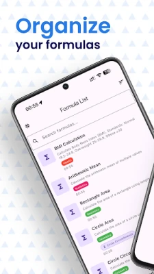 - Use tags to group formulas (geometry, statistics, BMI, physics, finance)