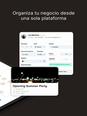Visualiza y asigna las reservas en tus diferentes espacios. Durante el evento, observa los datos de cada reserva y acompaña a tus clientes a su mesa.