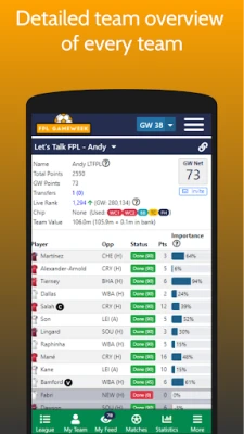 LIVE DATA We show your points, subs and rank in real-time! No waiting for FPL to update - see the true league impact of every goal, assist and clean sheet LIVE. We take care of the Autosubs, Captaincy switches and all the other stuff that can make it hard to know how well you're actually doing. Best of all, it's completely free.