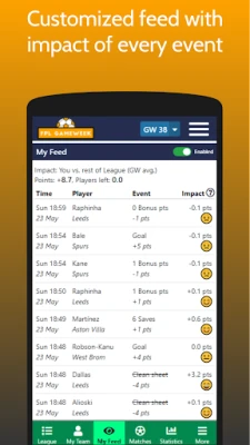 WHAT IS IMPACT? Our unique and proprietary algorithm can assess how many points you gained on your rivals from an event. Salah scored? Well this is good, but everyone in your league has him. You catch an Alonso assist though and you have probably just gained big! We show player 'Importance' (your relative stake in a player) and 'Impact' (how that event truly affected your mini-league) in the Live Feed.