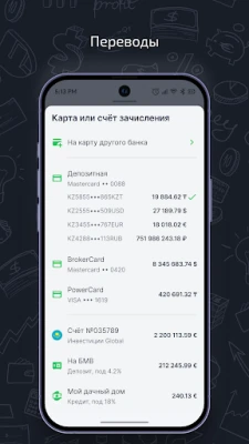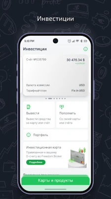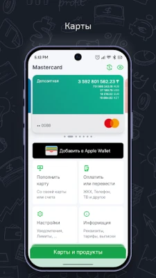 · Откладывайте деньги на депозит; · Конвертируйте валюту; · Оплачивайте коммунальные услуги, налоги, штрафы и другие услуги; · Управляйте настройками карты гибко, без посещения банка. · Отслеживание состояния займа; · Погашение ежемесячное, досрочное, частичное; · Пополняйте Брокерский счет быстро, без посещения отделения Банка;