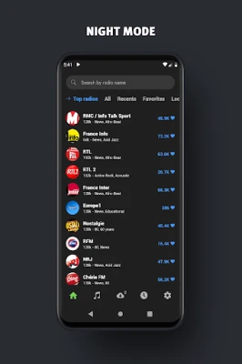 Use the Radio France application without delay to listen to all French radio stations live FM and AM such as France Info, RFI Monde, Chérie, RTL, Fun, RMC, Nostalgie, NRJ HITS, Rire et Chansons, Classique, Skyrock, B Business, Virgin, LATINA, 100 % Français R, Europe1, FIP, SUD, Orient, Beur and many other popular radio stations to discover!