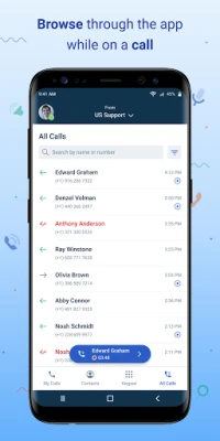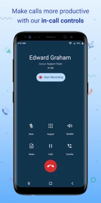 On-call functions: While on call, you can mute, transfer the call to another phone user, or put your call on hold to provide a clean customer experience. You can also navigate to other screens in the app while on the call.