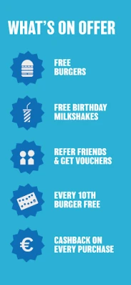 – A free burger on signup – Cashback with every purchase – Free Birthday treats – Vouchers when you refer friends – Every 10th burger free and more....