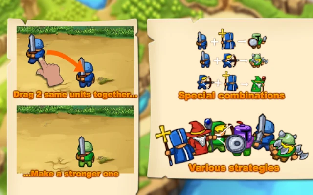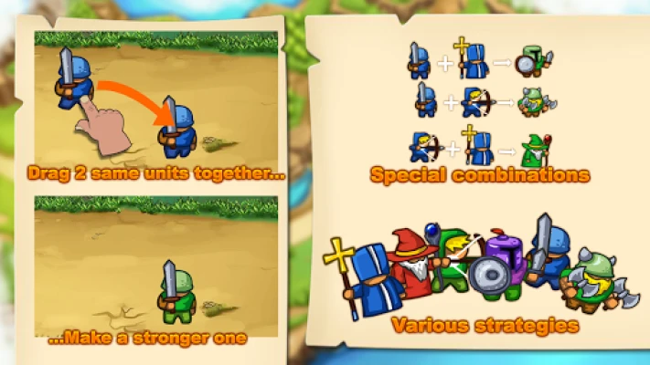 From the basic units Sword Man the Melee Warrior, Archer the Ranged Warrior, Priest the Healer, you can combine them to create Axe Man, Tank, Mage.