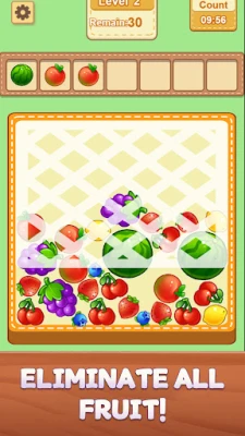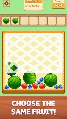 This casual puzzle game lets you match identical fruits as they fall onto the play area. Select matching fruits and fill the top tray to clear them. Then you can progress through levels—each with more fruits and trickier layouts.