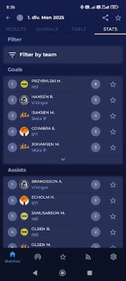 • Competition statistics including top goal scorers, assists, yellow cards, and red cards, including filter by team