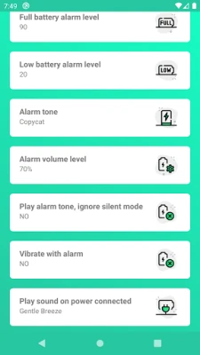 With custom battery level, you can choose alarm tone, volume level of alarm, notifications, Beep sound on power connected or disconnected, Small functions those are really useful and must have bydefault.
