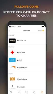Fulldive VR rewards you Fulldive Coins which you can redeem for Bitcoin cash, Ethereum & gift cards.