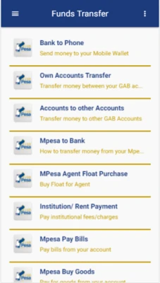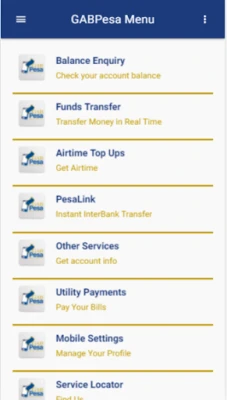 1. Balance Enquiry 2. Funds Transfer 3. Airtime Top Ups 4. PesaLink 5. Other services 6. Utility Payments 7. Mobile Settings 8. Service Locators 9. Invite A friend