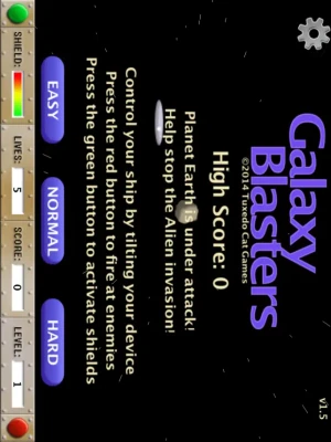 Galaxy Blaster is an arcade style, space shooter. You control your ship by tilting your device in the direction you want your ship to move (don't try "steering" like a racing game). Press the red button to shoot the enemies and the green button to activate your shields. Shields have a limited, recharging power supply, so keep an eye on the meter.