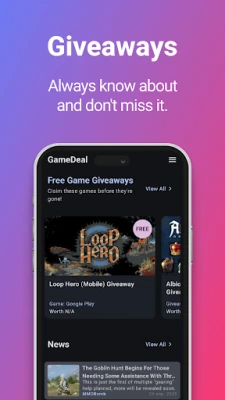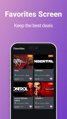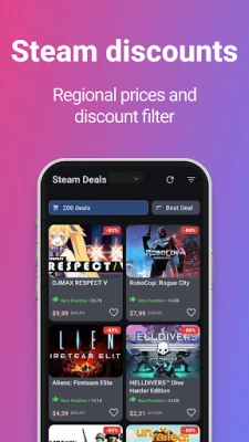 The GameDeal app is a new way to find sales and discounts in Steam and different game stores (included GOG, Epic Games Store, other) and the latest news about games. A quicker way to access the best Steam Sales on your device. All Steam and other stores sales updated in real time. You will never miss the best gaming deals to be found online again! Take charge of your wishlist and ensure you always get your favorite game titles at the lowest possible price, anytime, anywhere.