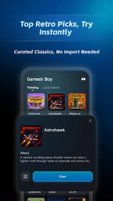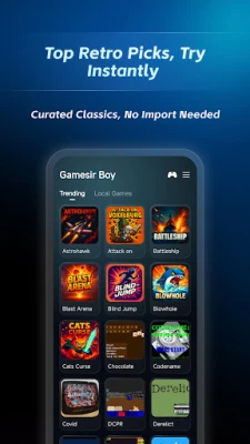 Discover a curated library of popular retro games and seamlessly manage your personal collection through the intuitive “Local Games” section. The app supports importing your own game files or folders via multiple methods, letting you dive straight into your favorite classics. Enhance your gameplay with built-in features like save/load states, fast-forward, and more, all tailored for a smooth and customizable retro gaming experience. App Features: • Core Purpose: A specialized emulator focused on delivering authentic retro gaming. • Local Collection Management: Robust support for importing and organizing your own game files and folders. • Enhanced Gameplay Tools: Equipped with convenient features including save states, fast-forward, and more for optimal control.