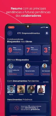 Pelo aplicativo você conseguirá uma ampla visão dos seus colaboradores em todas as obras presentes, com a possibilidade de solucionar seus bloqueios e pendências.