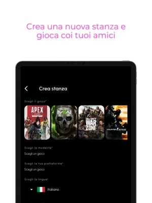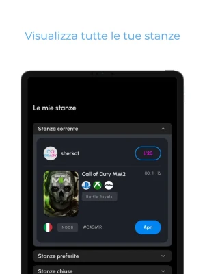 · Stanze: crea o partecipa a stanze per organizzarti con altri giocatori, filtrando per piattaforma, gioco, modalità, lingua, numero di giocatori necessari e durata della ricerca. Puoi inoltre aggiungere la stanza ai preferiti in modo da poterci entrare in qualsiasi momento.