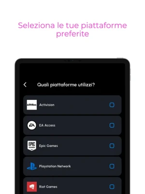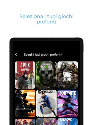 · Profilo: imposta le tue preferenze e i tuoi profili di gioco per facilitare gli accessi e le interazioni. Potrai anche collegare gli account social per permettere agli utenti di individuarti su altri canali.
