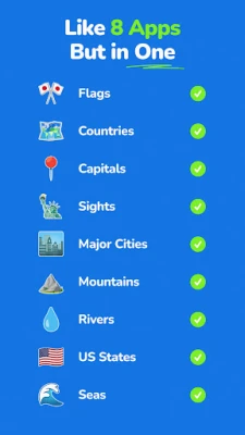 The app includes challenges in the following categories: - Countries of the continents - Capitals of the continents - Flags of the continents - Metropolises of the continents - U.S. states - Mountains of the continents - Rivers of the continents - Tourist attractions of the world - Oceans of the world