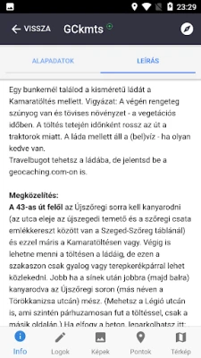A Magyar Geocaching KHE adatbázisára épülő geoláda térkép. Főbb funkciók: - Geoládák listázása és a megtalálások bejelentése (geocaching.hu) - Ingyenes felhőtárhely a saját adatok biztonsági mentéséhez - Számos raszteres térképtípus (akár offline is) - Útvonaltervezés - GPX fájlok importálása/exportálása, több száz instant túra útvonala a nyomvonal katalógusban - Kéktúra szállások, bivak-helyek és dendománia adatok a heyjoe.hu oldalról - Köz- és ivókutak a közkutak.hu adatbázisából