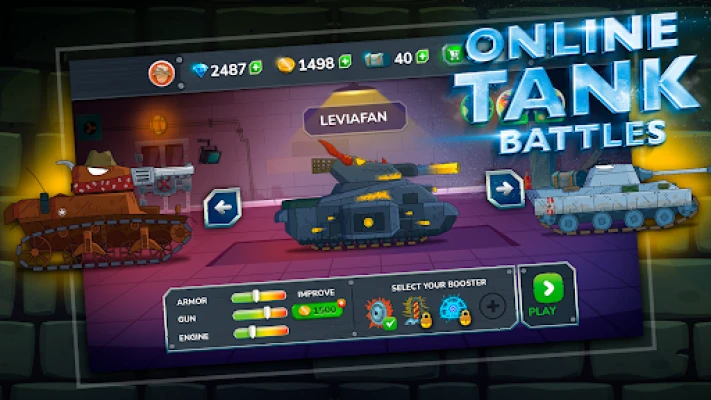 In 1x1 online tank battles (and soon there will be 2x2 online mode), you will have to fight an opponent you randomly get on the battlefield. Hold out in this war for 60 seconds, or more, destroy the enemy, and game coins will ring in your piggy bank! And with them, you can improve your tank and buy a booster.